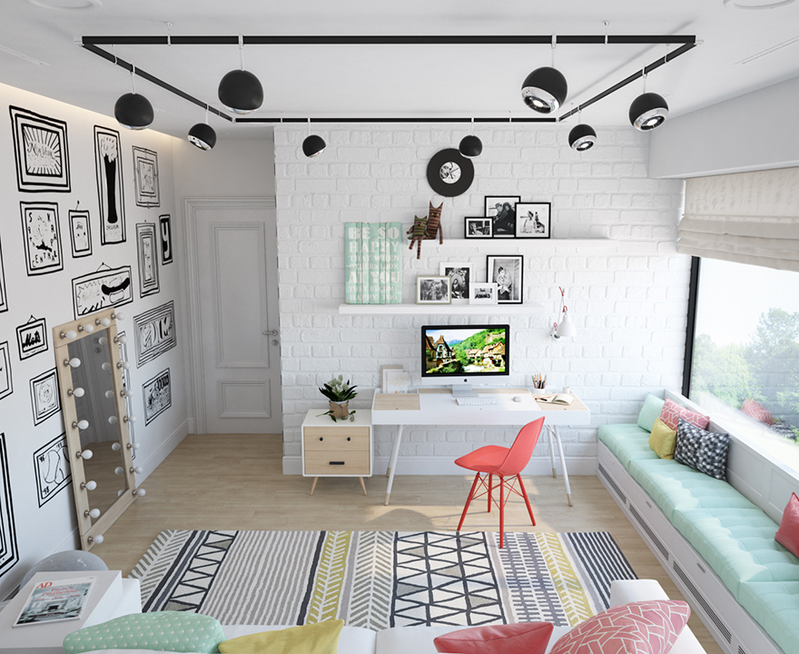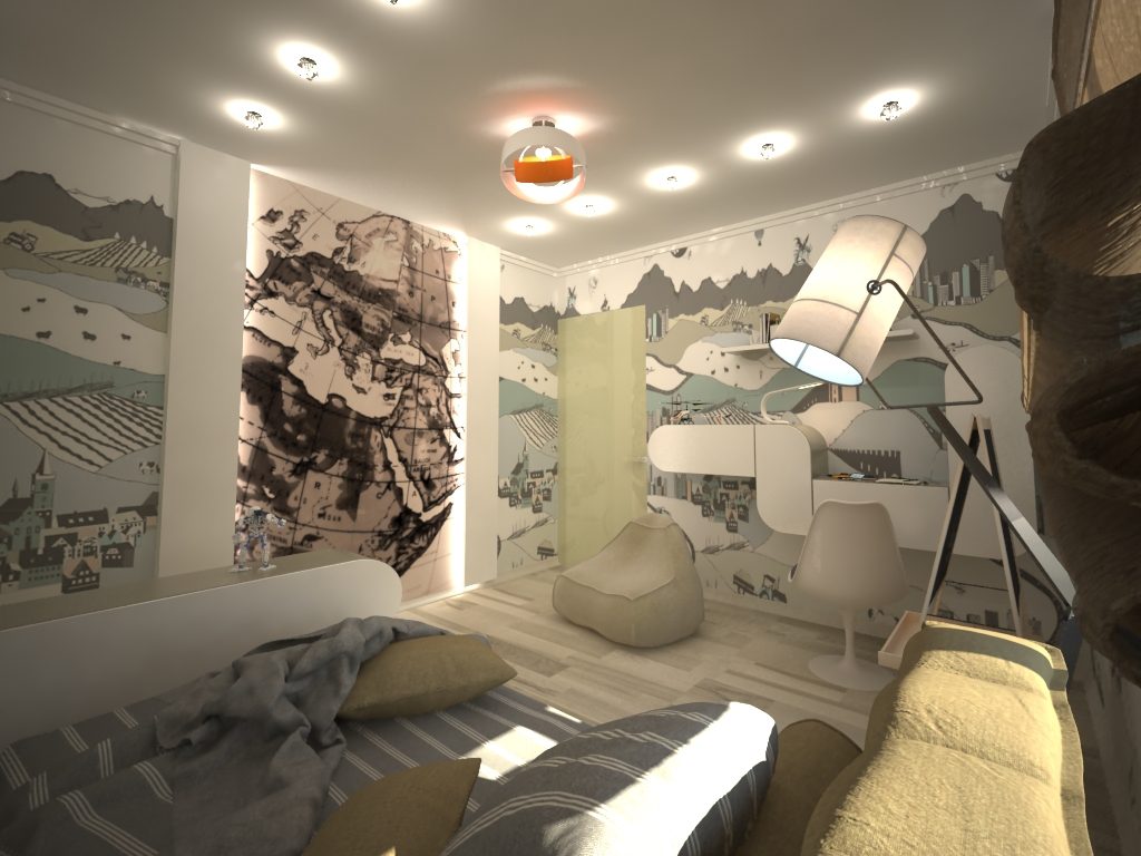 - Освещение для чтения. Для дизайна детской комнаты необходимо предусмотреть основное и точечное освещение, а также ночник. На письменном столе обязательно разместите настольную лампу, отвечающую медицинским требованиям, в зависимости от возраста ребенка. Важно выбирать изделия, легко поддаваемые уборке.