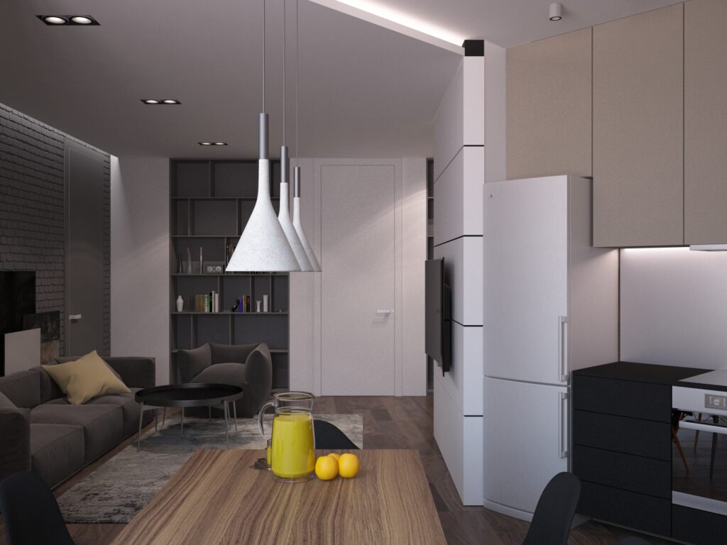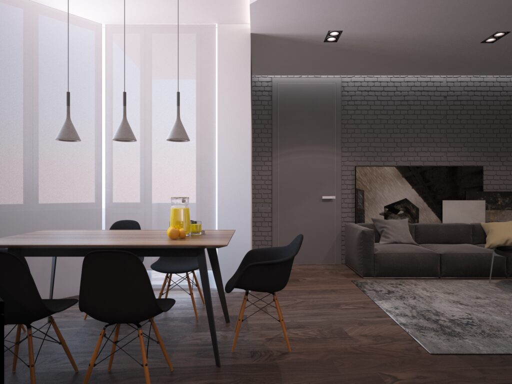 5. Освещение. Данная деталь всегда является одной из решающих при оформлении помещений. Но в случае с минимализмом, она становится еще более важной. Данный стиль требует простора и большого количества света. Поэтому мы максимально задействовали в оформлении помещения имеющиеся окна, дополнив их искусственным светом. Последний также позволил зонировать жилье. А три подвесных светильника, установленных над обеденным столом на кухне, позволили сделать помещение еще более уютным.