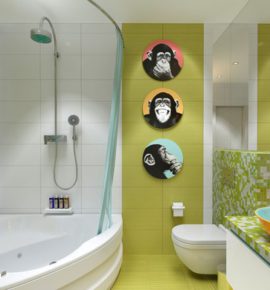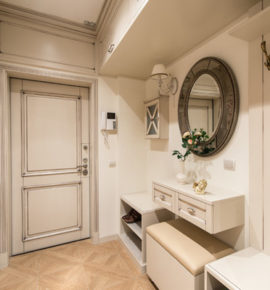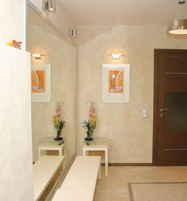 Зеркало, картины на стенах, тумбочки для обуви возле стены, скамью для сиденья