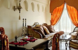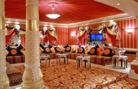 Арабский интерьер наполнен дорогостоящими тканями, типа атласа и шелка, которые дополняются кистями. Также в нем обязательно должны присутствовать яркие стеганные подушки, ковры с удивительными узорами и фигурные зеркала.